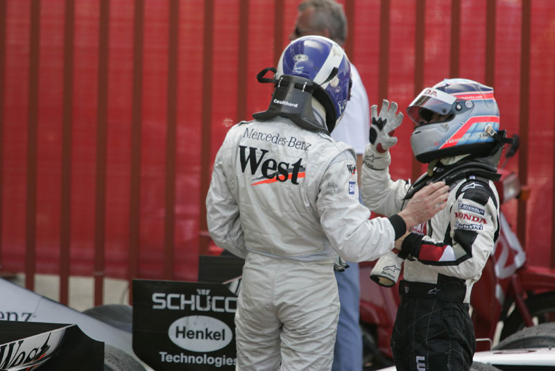 予選後の記者会見。ミハエル・シューマッハーと並んで質問を受ける