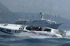 昨日レースが終ったばかりのモナコの街をバックにボートを操る。後ろにカジノも見える