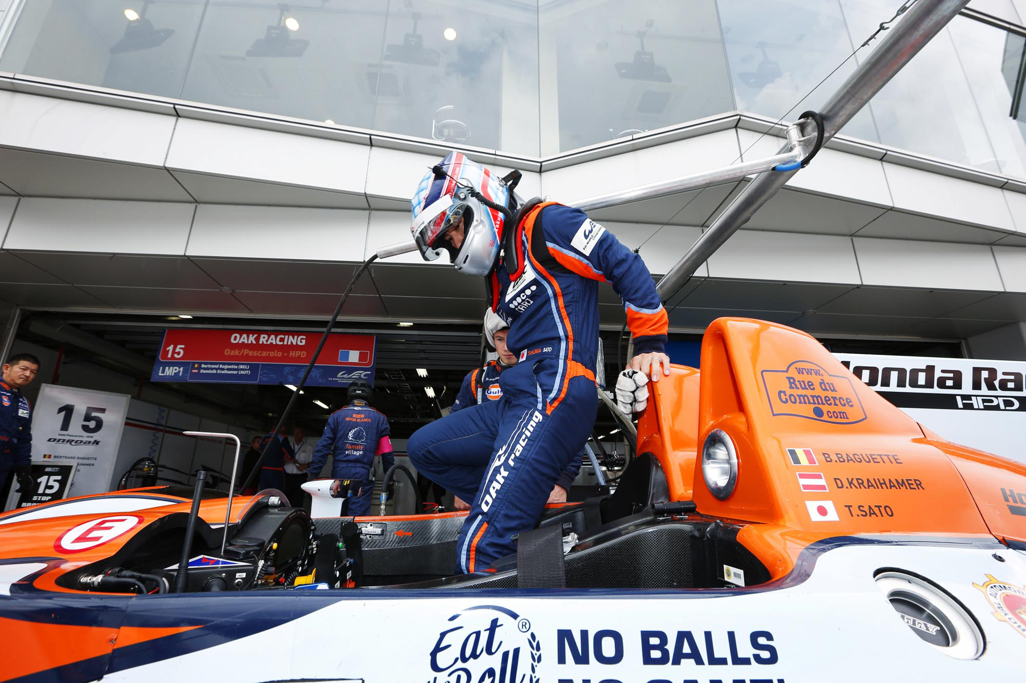 OAK racing のペスカロロ・ホンダのマシンに乗り込む。フォーミュラとは違う大きなコクピットだが、3人のドライバーが交替しながらマシンを走らせる