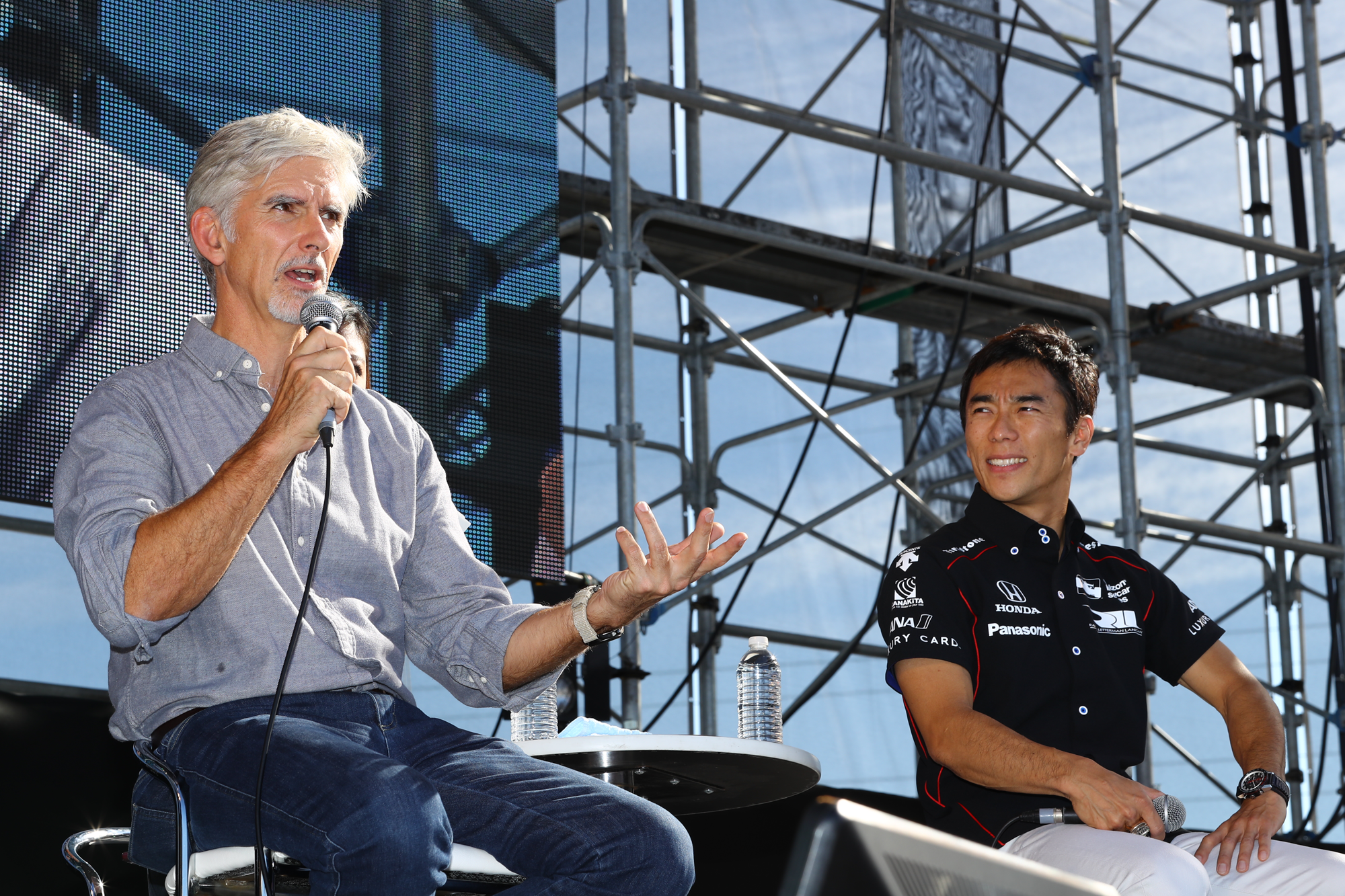 土曜日の予選後にステージに行きマクラーレン・ホンダのトークショーに乱入。インディ500のチームメイト、アロンソと2ショット!