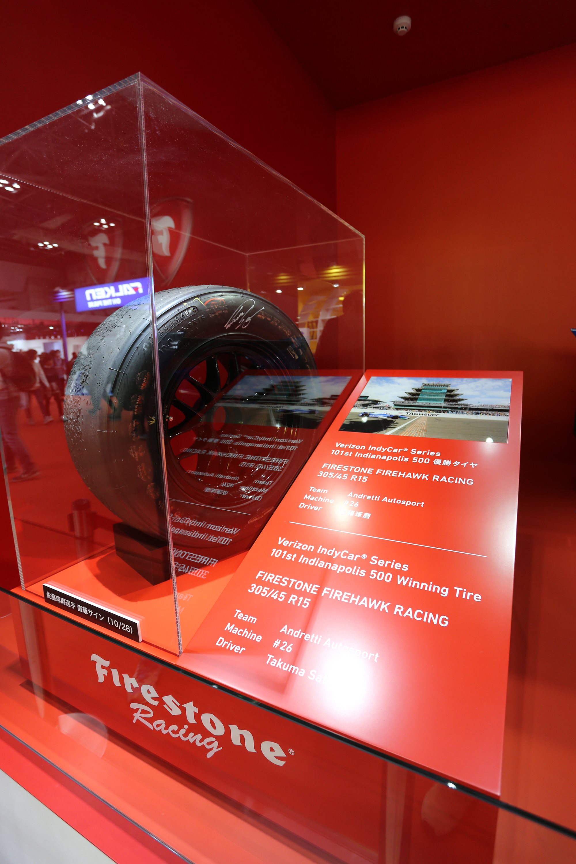 優勝したマシンに取り付けられていたファイアストンのタイヤ展示も
