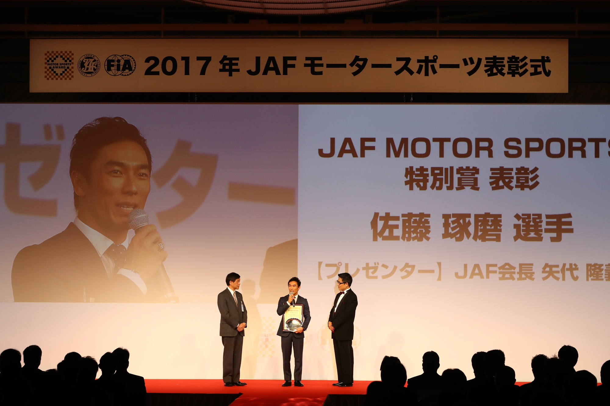 2017JAFモータースポーツ表彰式に出席。インディ500日本人初優勝の偉業を讃えてJAF MOTOR SPORTS 特別賞を受賞。JAF八代会長より表彰状を授与される
