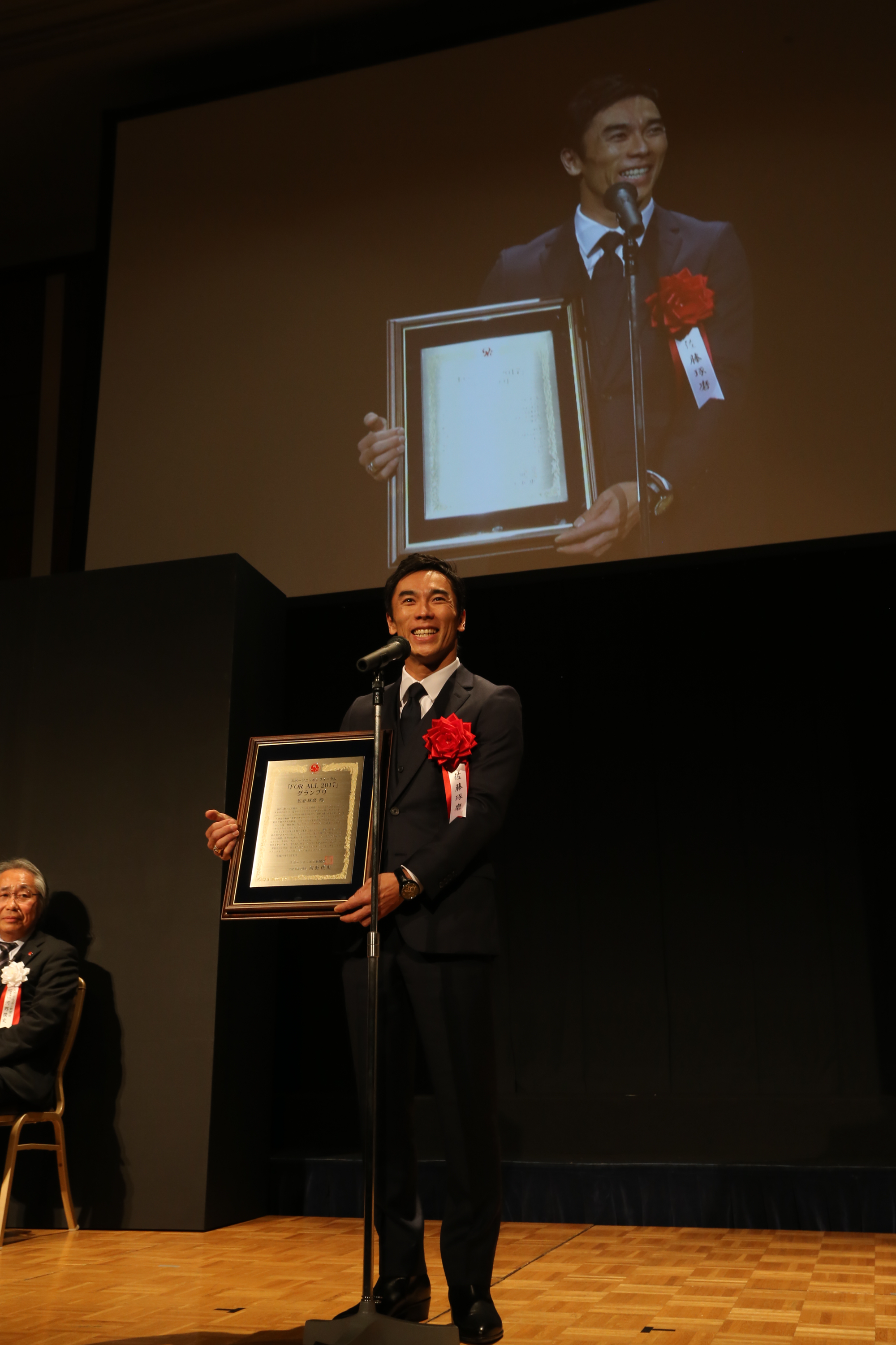 スポーツニッポンフォーラムの「FOR ALL 2017」にてグランプリに選ばれスポーツニッポンの河野俊史社長から盾を授与される