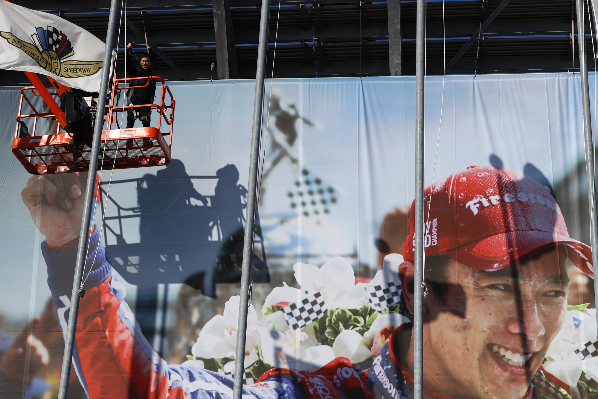 インディアナポリスモータースピードウエイ(IMS)に到着するなりハーネスを繋がれてクレーンのゴンドラへ。背景のバナーと同じ一番ポーズで上昇開始