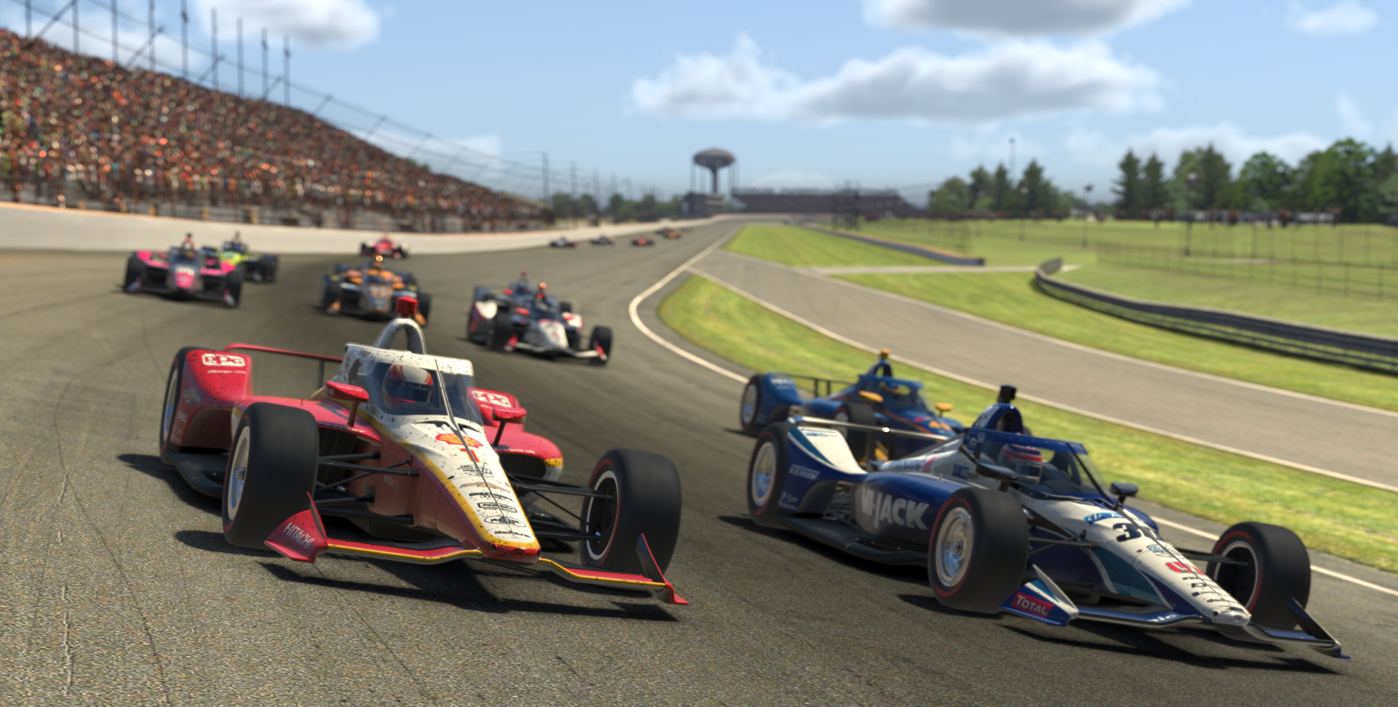 30万人が詰めかけるIMSも再現。実際のレースと同じ全33台でシムレースが行われた