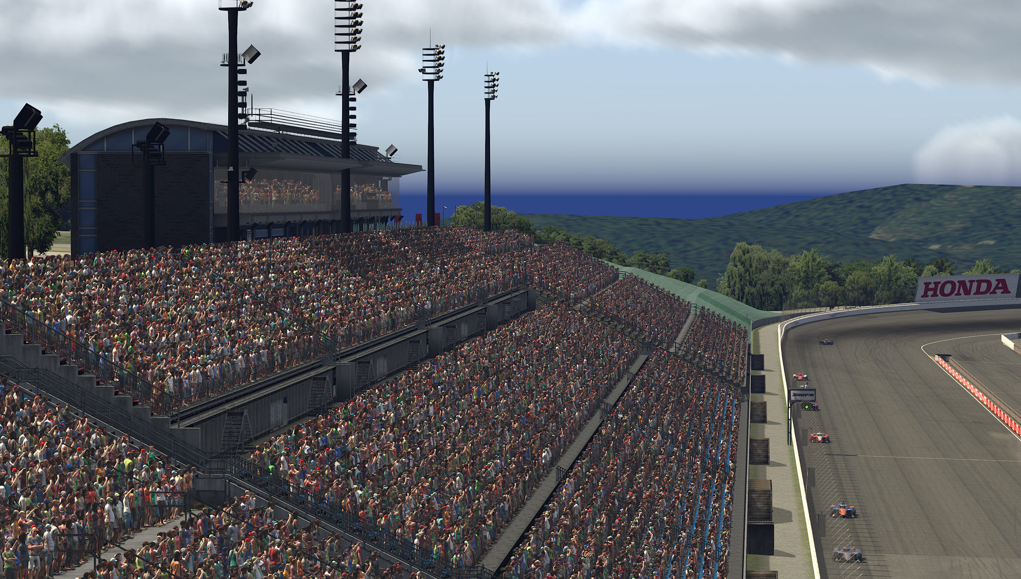 ファンでいっぱいになったもてぎのグランドスタンド。実現できなかったインディジャパンが復活!