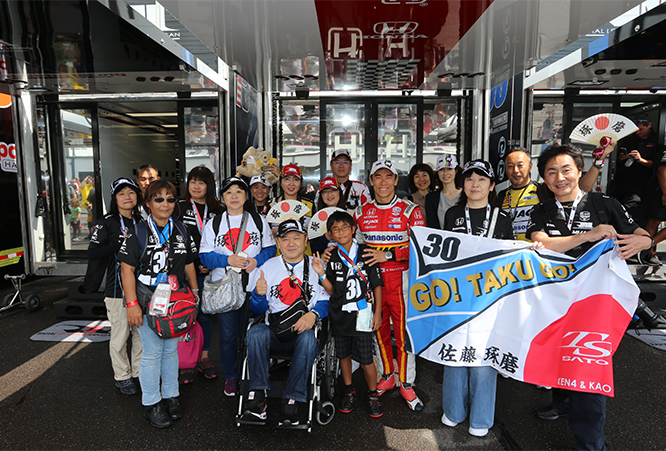 | ラインは2列。もちろん琢磨選手のいるラインに並びました。列に並ぶこと1時間少々、ドライバーズカードや、持参したグッズに、それぞれサインをゲットしました!現地の方もそれぞれ贔屓のドライバーがいて、一緒に写真を撮ったり、握手したり、みんなフレンドリーでした。F1をイメージしてIndyに来ると、雰囲気の違いに驚く方が多いかもしれません。無事にサインもゲットでき、決勝まで時間ができたので、各々昼食を取ったり、パドックを散策したり、屋根のある観戦席で休憩したりして過ごしました。 |