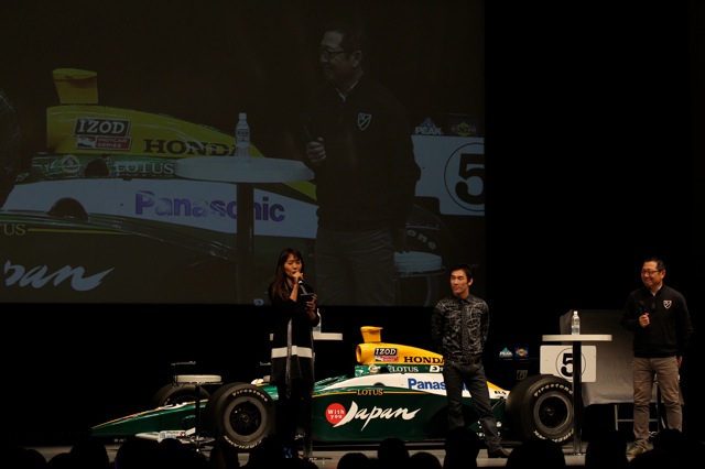 続いては、こちらもお馴染みの質問コーナー。東京公演に続いて、琢磨君の熱烈なファンのグループが大仕掛けを用意し、指名されるのをいまかいまかと待っています。何人かに質問していただいてから、ついに彼女たちの順番がやってきました。質問の内容は東京公演とは変わっていましたが、10題の質問に琢磨君がマル・バツのフダを掲げて答えるという形式は前回とまったく同じ。途中に「ちなみに、いまは第6問である」なんていう引っかけ問題も含まれていて、なかなか鮮やかな構成でした。もうひとつ印象に残ったのは、「もしもF1参戦のチャンスが舞い込んできたら、どうしますか?」という質問。さすがにこれには琢磨君も答えに困っていたようですが、「F1は自分のなかでもやり終えたという気持ちがしていない。でも、インディカーもまだ始まったばかり。まずはインディカーで優勝して、チャンピオンを獲って、それでもF1の話しがきたら考えるかもしれません」と回答。琢磨君のその真剣な答えに、会場からは温かい拍手が送られました。