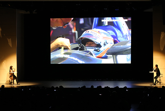 この言葉に続いてステージへの登場を促されたのは、ご存じ佐藤琢磨選手。会場はわれんばかりの拍手に包まれました。